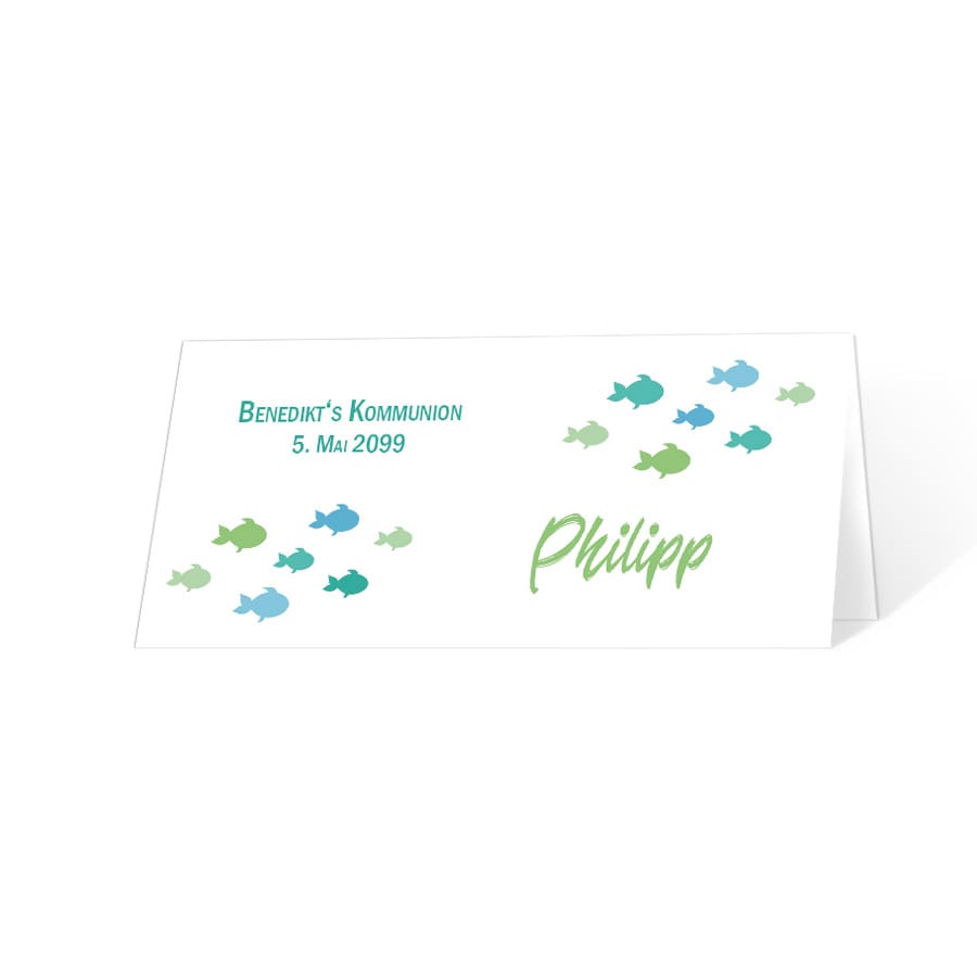Tischkarten "kleine Fische" für die Kommunion in blau ...